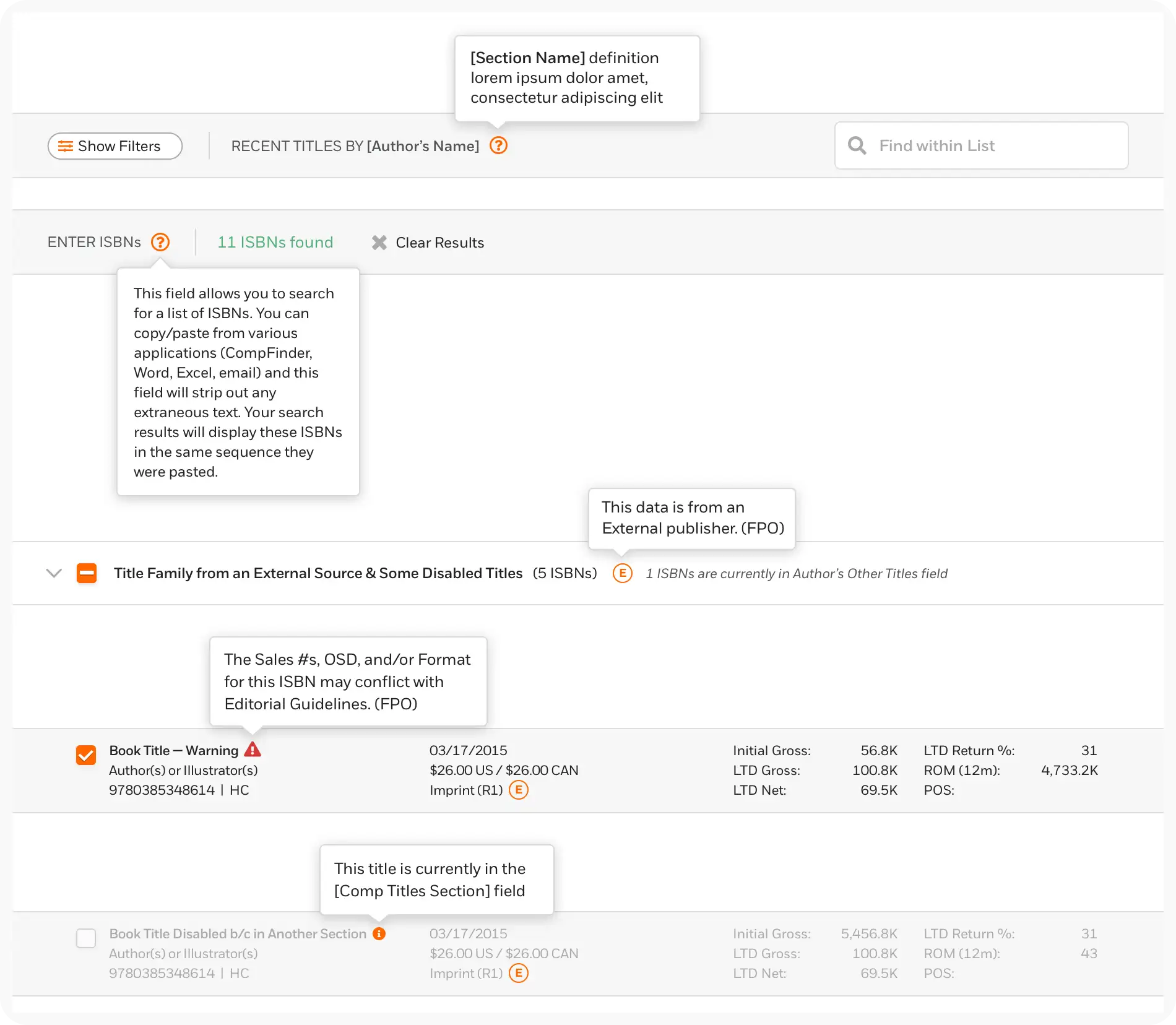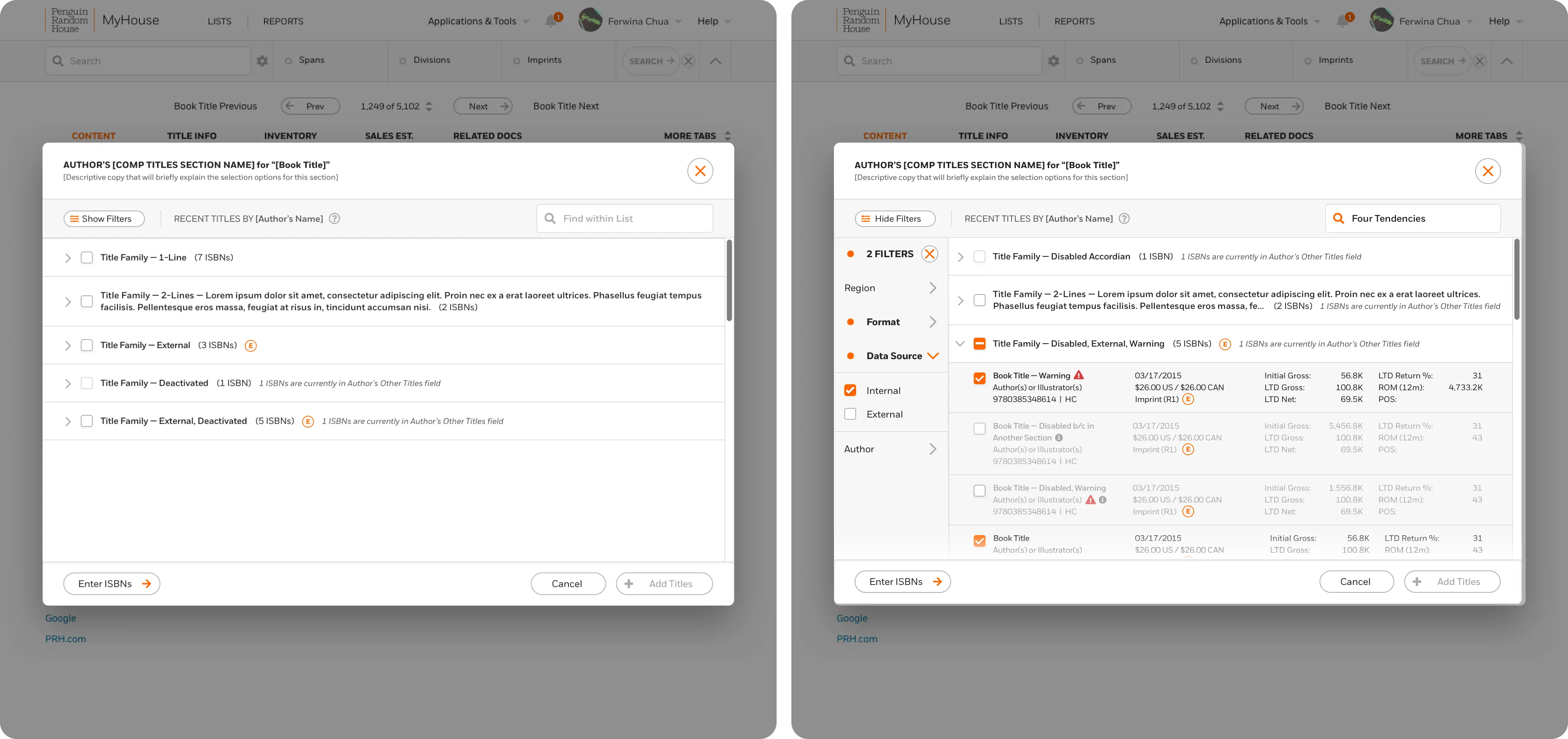 Redesigned a multi-modal selection system for comparative titles, featuring a dynamic accordion interface, advanced filtering, and bulk selection