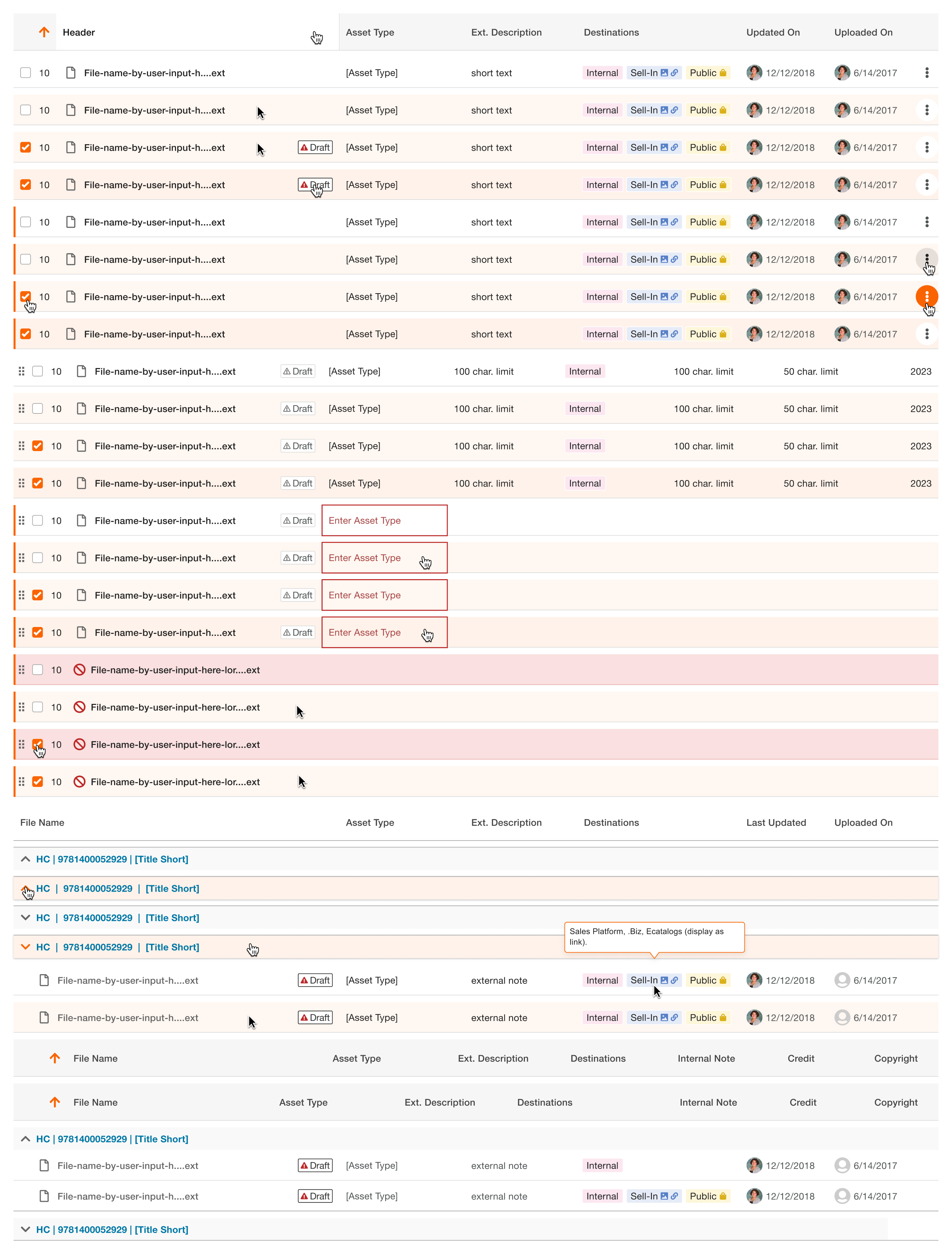 Designed sophisticated table interfaces displaying multiple data points (file names, descriptions, asset types, copyright info, internal notes, etc.)